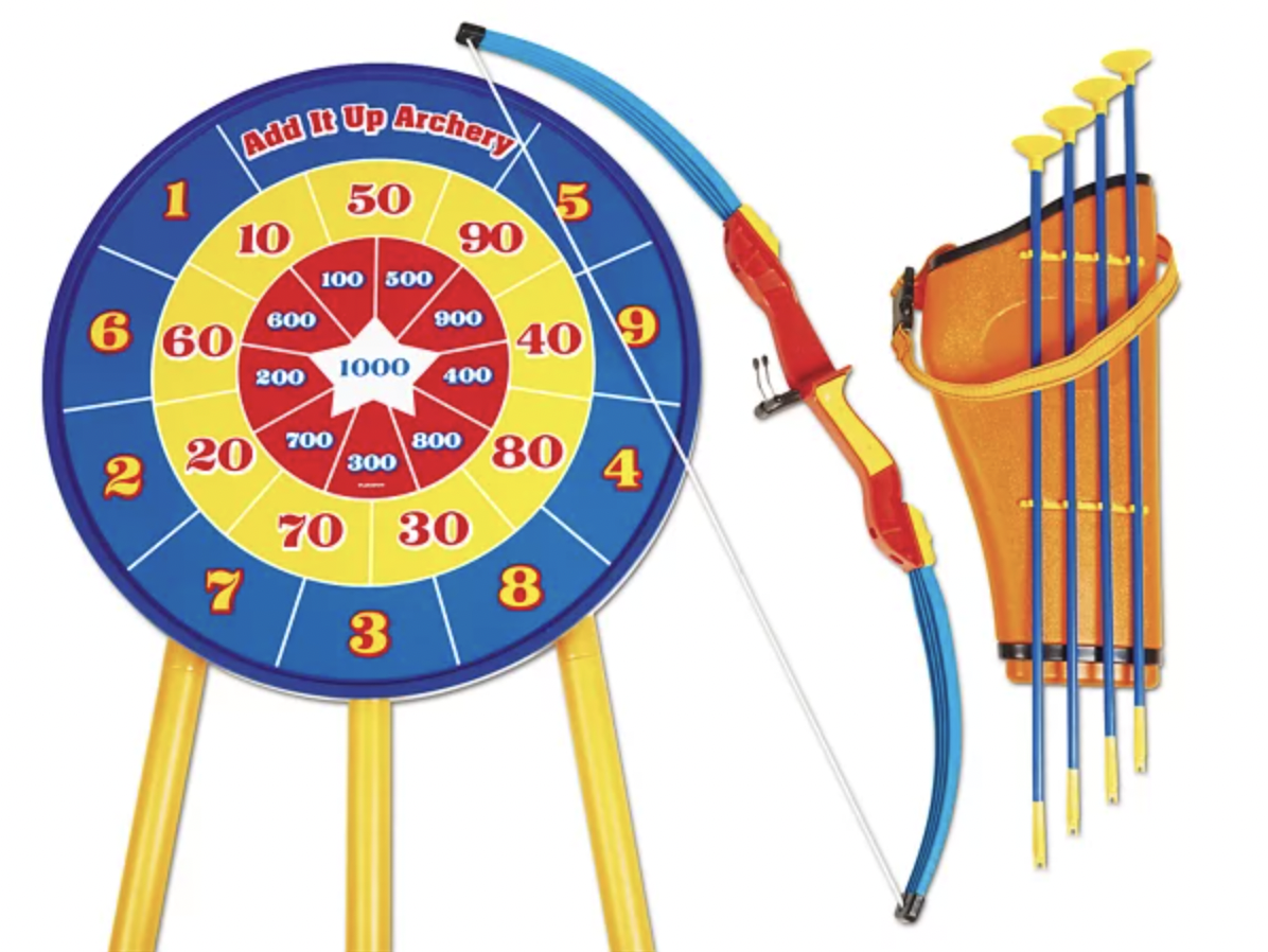 Có kích thước phù hợp với trẻ em, bộ bắn cung siêu an toàn của chúng tôi cho phép trẻ em bắn trúng hồng tâm…khi chúng thực hành toán học! Trẻ em chỉ cần sử dụng một cây cung nhựa dẻo để bắn những mũi tên cốc hút an toàn vào mục tiêu—cộng các con số khi chúng chơi! Bạn nhận được 4 mũi tên, cộng với một cây cung, bao tên, mục tiêu và đứng.