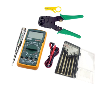 Gồm bộ tuốc nơ vít các loại, kìm bấm dây mạng RJ45, RJ11, bút thử điện, đồng hồ đo điện đa năng.