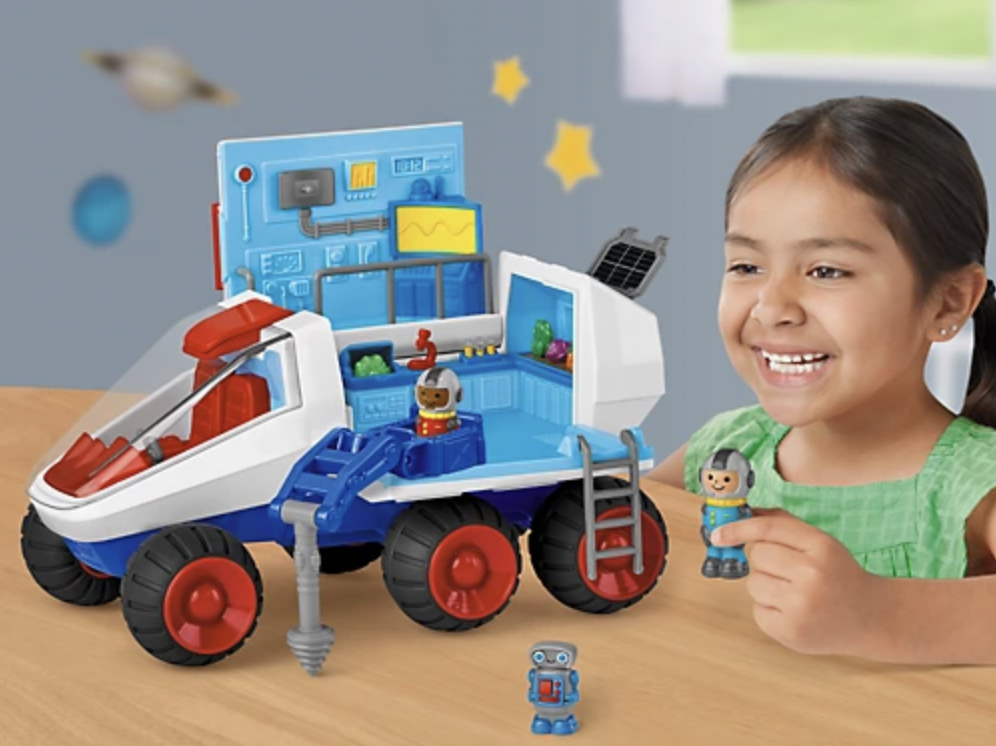 Our rover is on a mission for adventure! With tons of play space inside and out, this rover is ready for nonstop excitement! The 2 snap-in astronauts and robot can climb on and off using the flip-down ladder, steer from the two-seat cockpit, dig for discoveries with the swiveling drill rig and lots more. Plus, the free-rolling rover has so many authentic details built right in—from a command center to a robot charging station—kids’ imaginations will blast off for hours of cosmic fun! Rover measures approximately 13 3/4" in length.