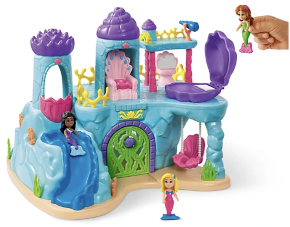 Hòa mình vào cuộc phiêu lưu dưới đáy biển—cung điện biển quyến rũ này được tạo ra để giải trí bất tận! Với không gian vui chơi thú vị được xây dựng ngay bên trong, cung điện có các đặc điểm mê hoặc ở mọi phía—để 3 nàng tiên cá có thể tạo dáng ngồi trên ngai vàng hoàng gia, trượt xuống cầu trượt và hơn thế nữa. Thêm vào đó, cung điện có một phòng khách đầy đủ tiện nghi… một phòng ngủ với bàn trang điểm bằng vỏ sò và giường vỏ sò có thể đóng mở… thậm chí cả cổng và xích đu của cung điện hoạt động như thật! Cung điện có chiều dài 14 1/2".